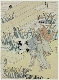 L’un de ces contes se déroule justement près d’un étang d’iris. Situé dans la province de Mikawa, il présente un pont de bois formé de huit segments. Ce pont, nommé yatsubashi, fut par la suite maintes fois mis en scène dans la peinture classique.